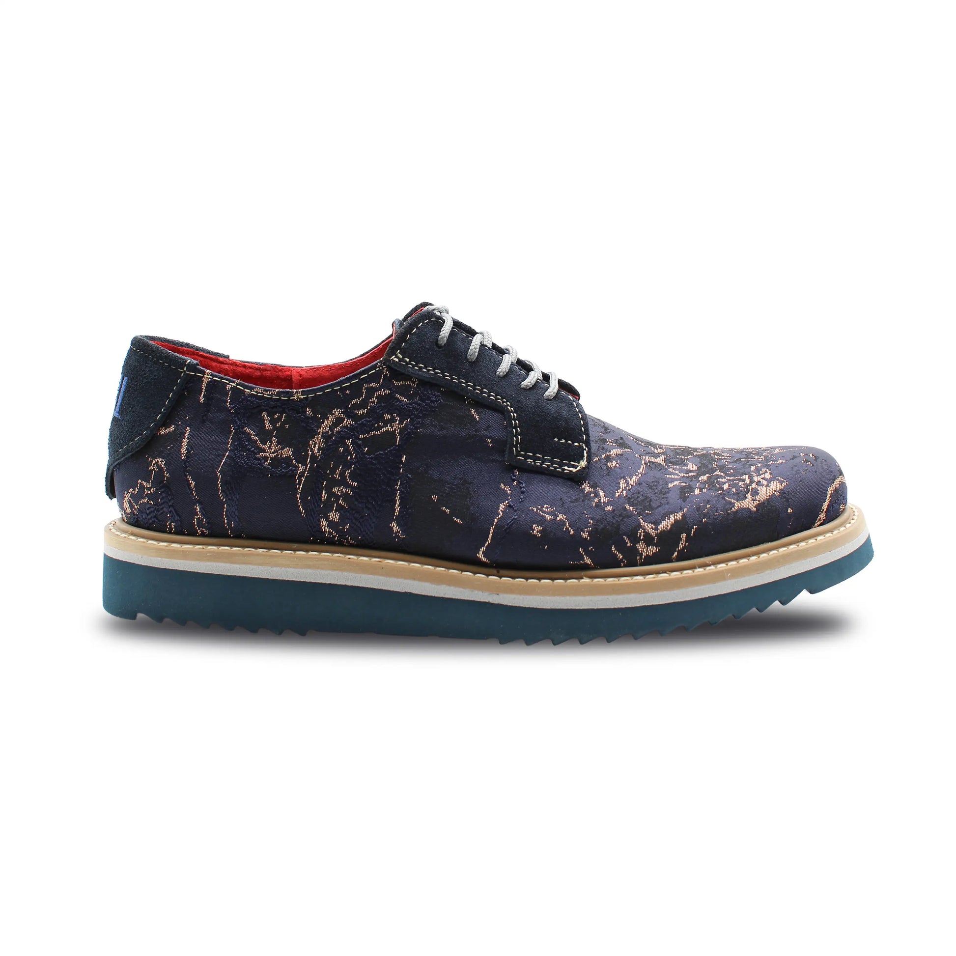 Artistic deep-blue upper with metallic lava streak accents
