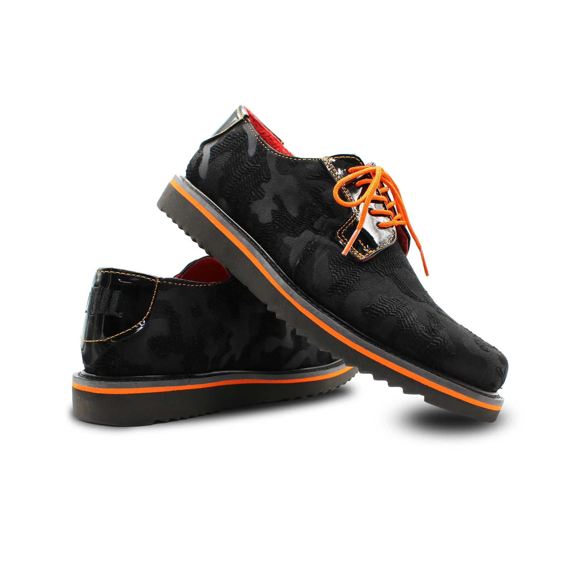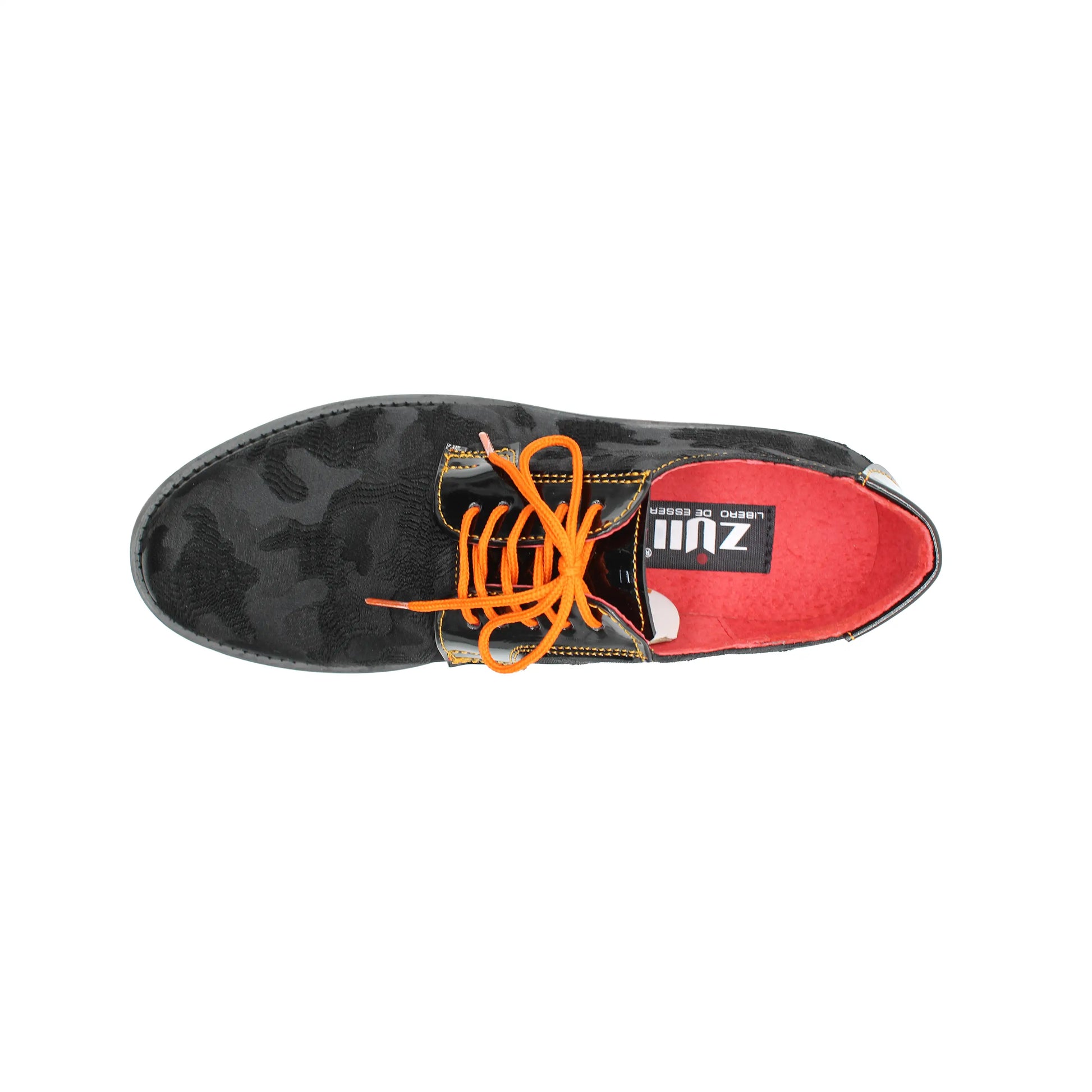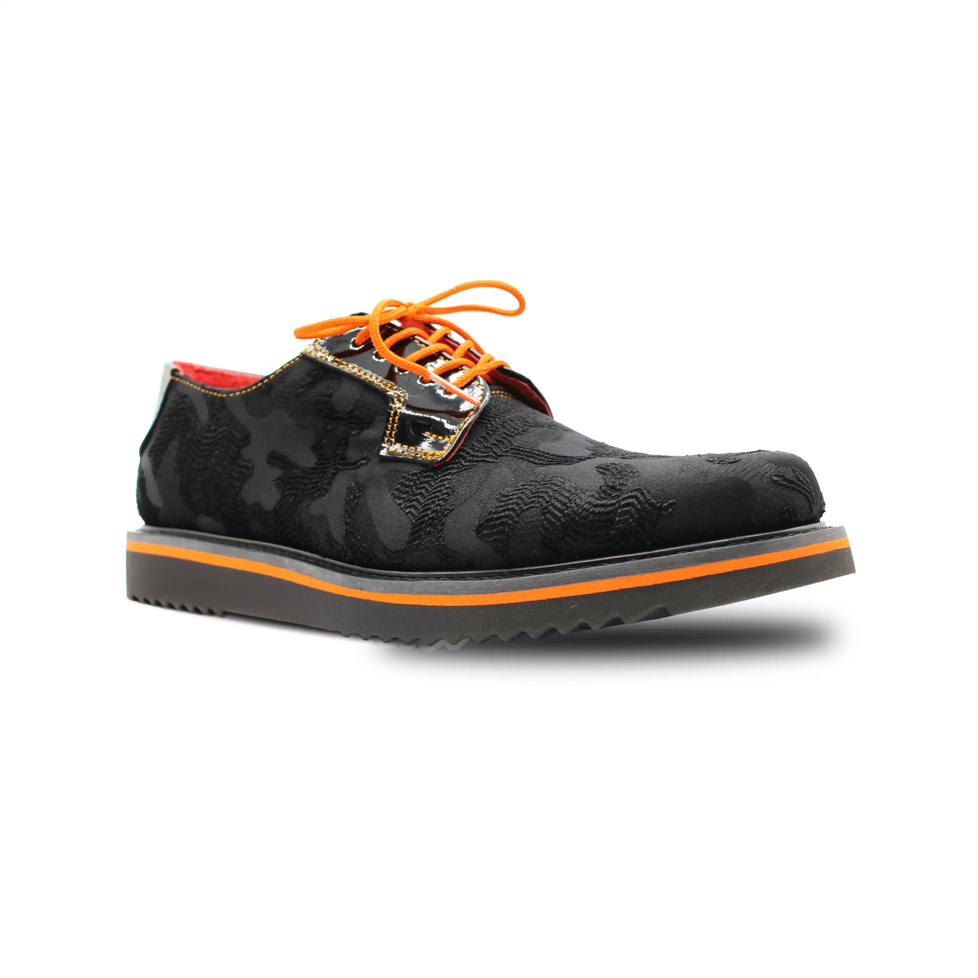 The RA-04 Black Camouflage blends texture, contrast, and attitude. Crafted in suede with a camouflage pattern, accented with black patent leather details, bold orange laces, and an XL Extralight® sole with a color line that breaks the rules of the classic.