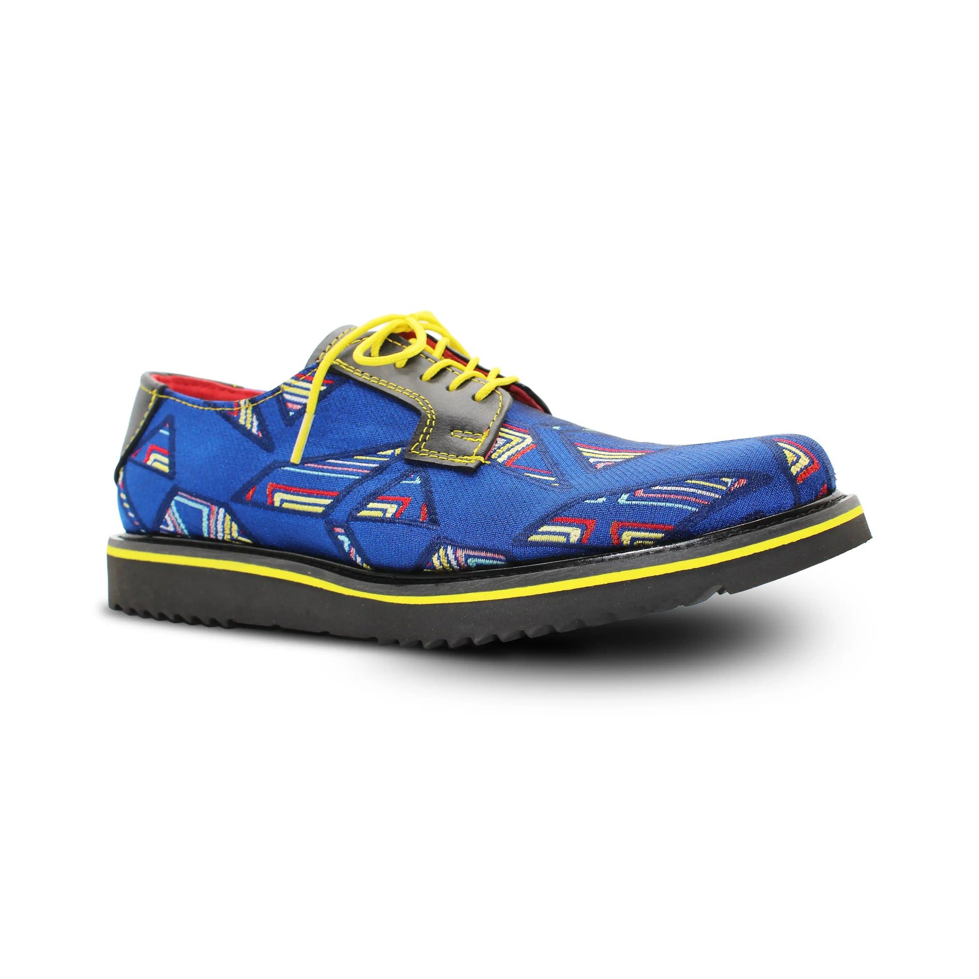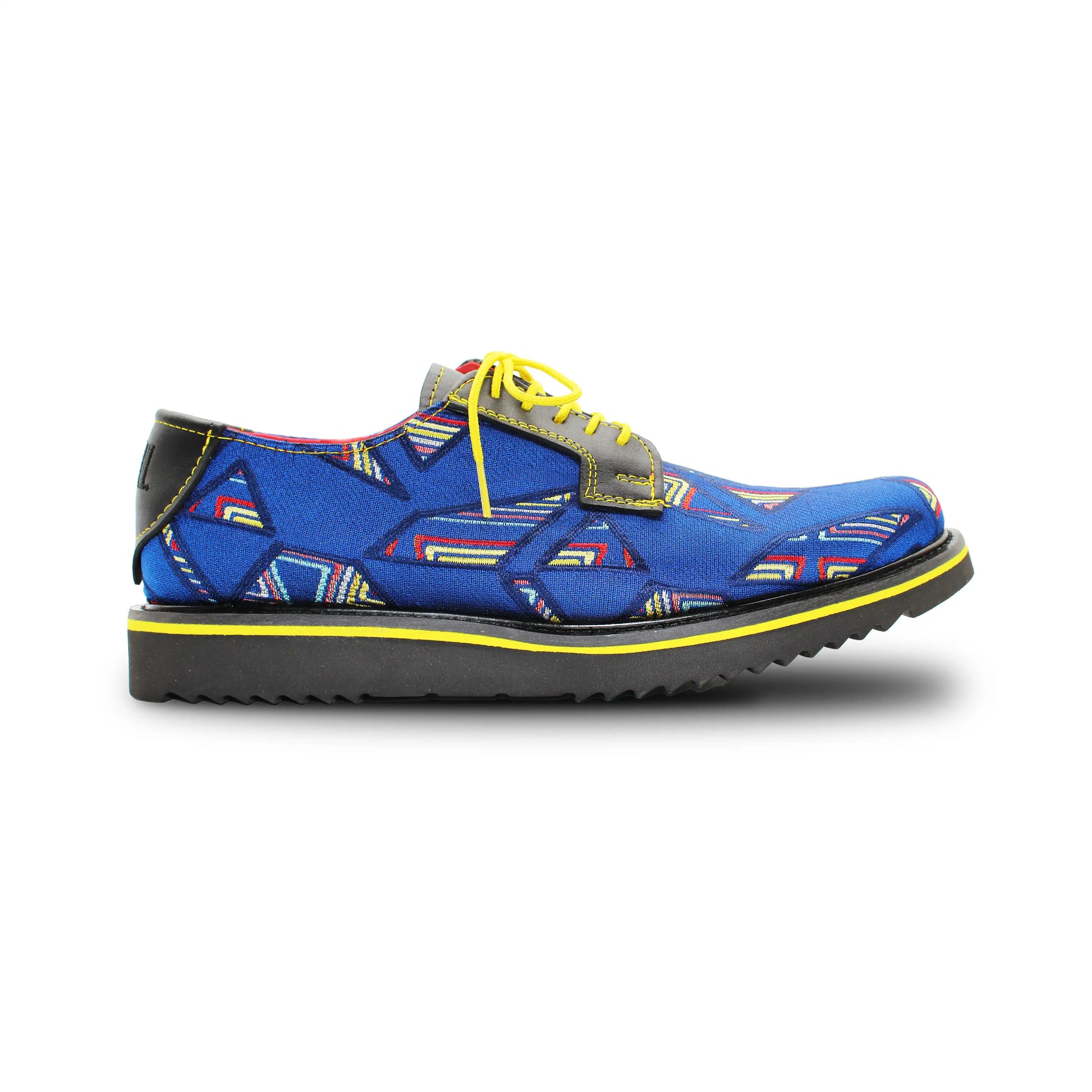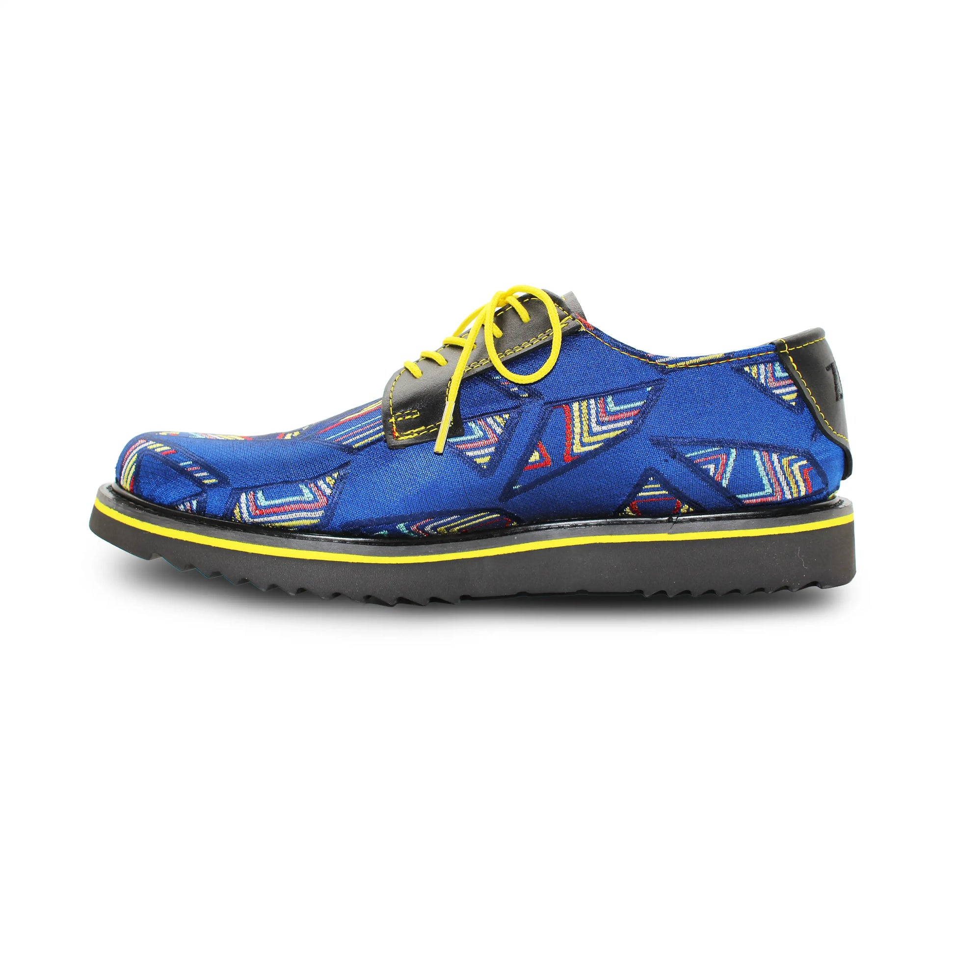 Men’s Derby crafted in textile cut imported from India, woven in a Jacquard system with satin threads in royal blue tones and multicolored asymmetrical figures that make it unique and sophisticated.