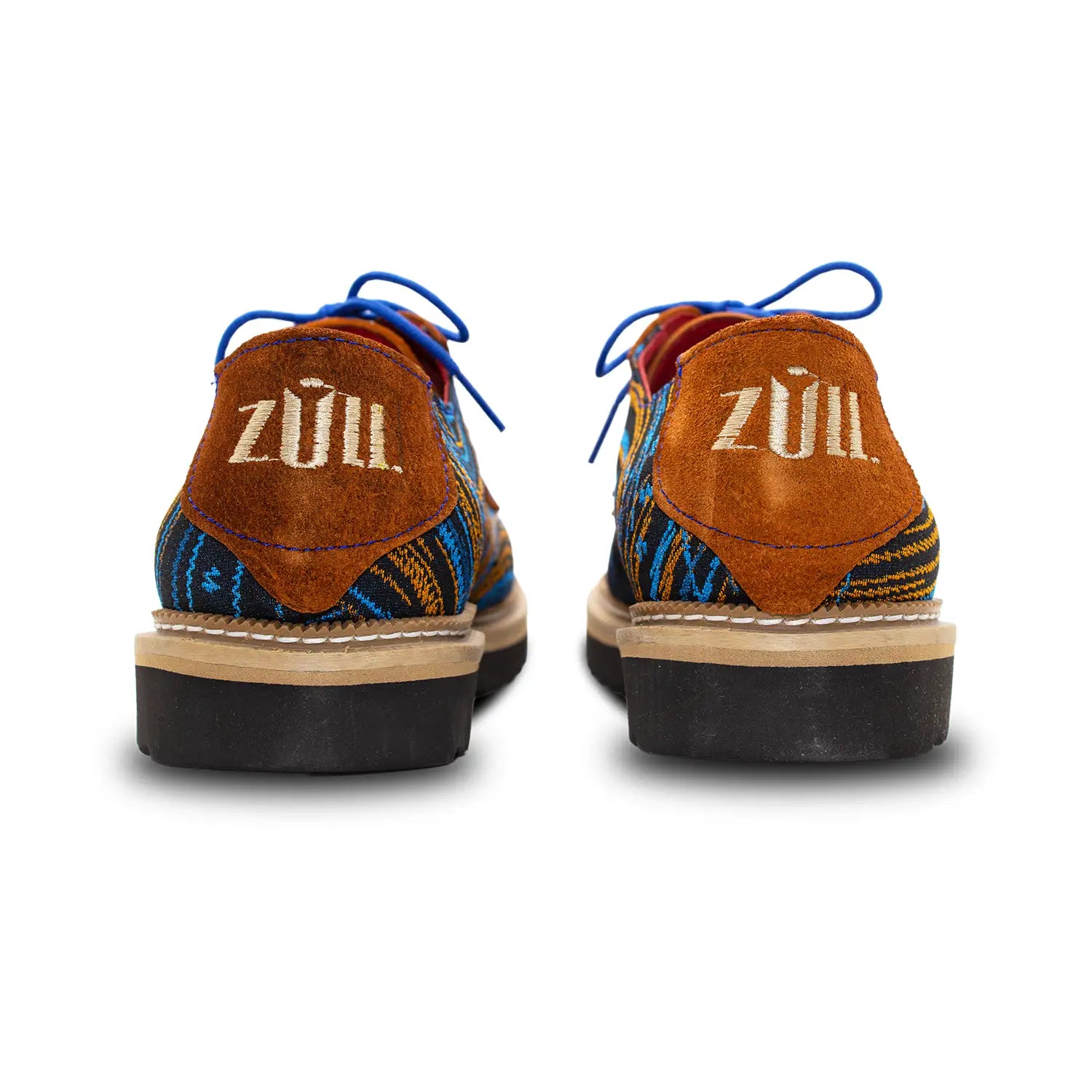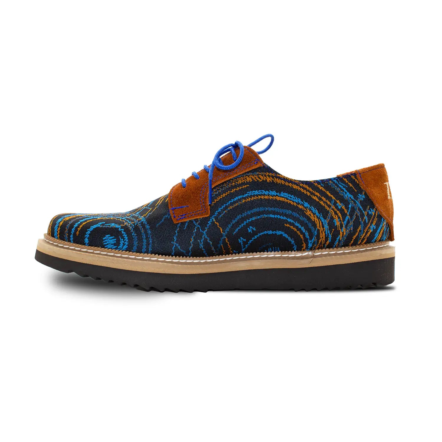 A design that turns heads with its mustard and blue spiral print, evoking movement and vitality. The contrast with earth-toned suede panels and electric blue laces gives this shoe a bold, distinctive character. Its serrated sole offers lightweight comfort—perfect for those who seek style without compromising practicality.