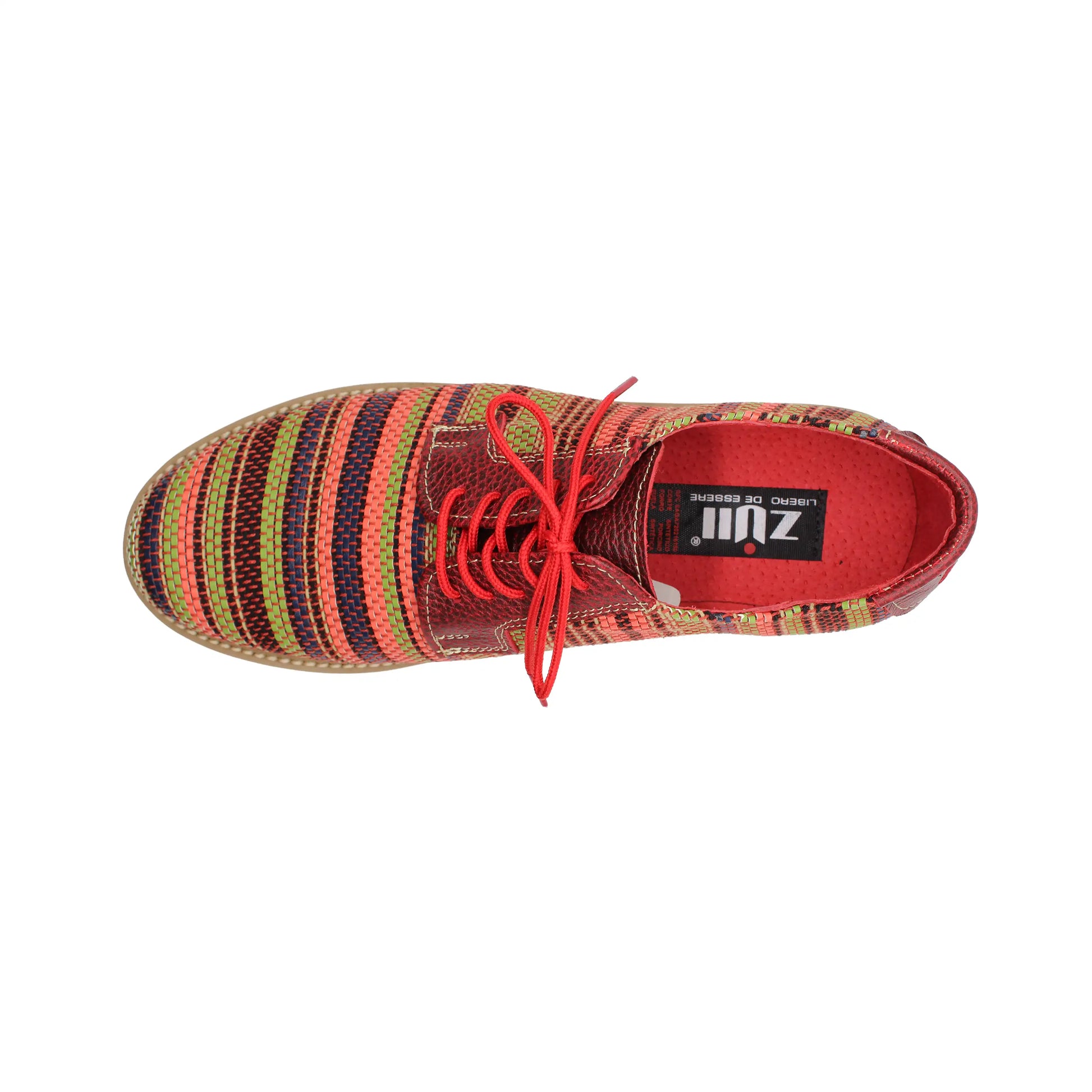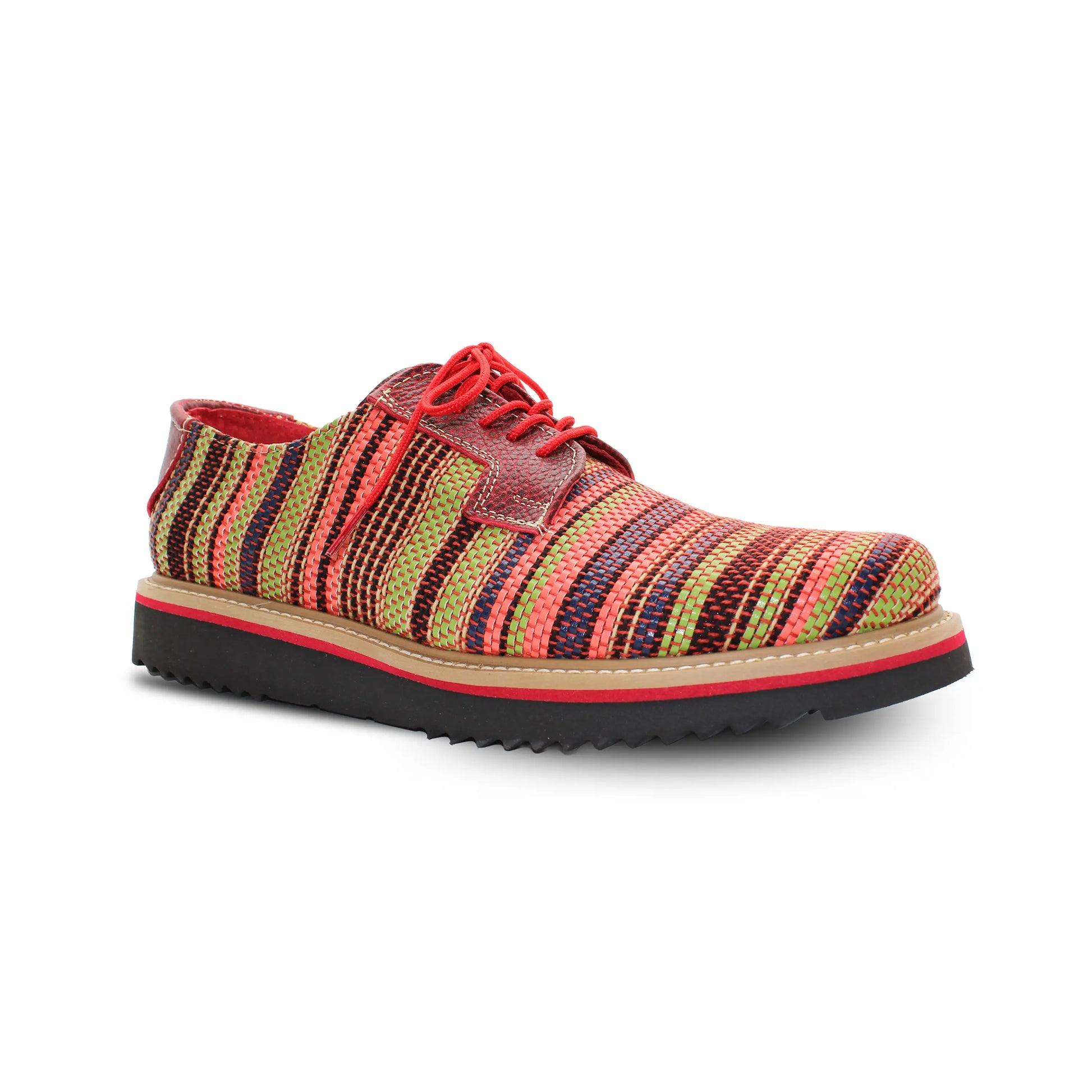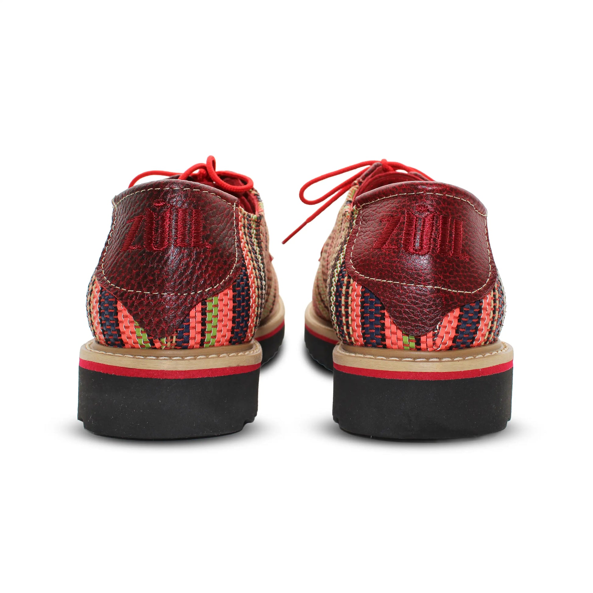 Crafted 100% by hand by artisans from León, this Derby combines tradition with contemporary style. Its upper in artisanal zarape fabric stands out with vibrant tones of burgundy, red, green, and yellow, evoking the richness of Mexican culture in every detail.